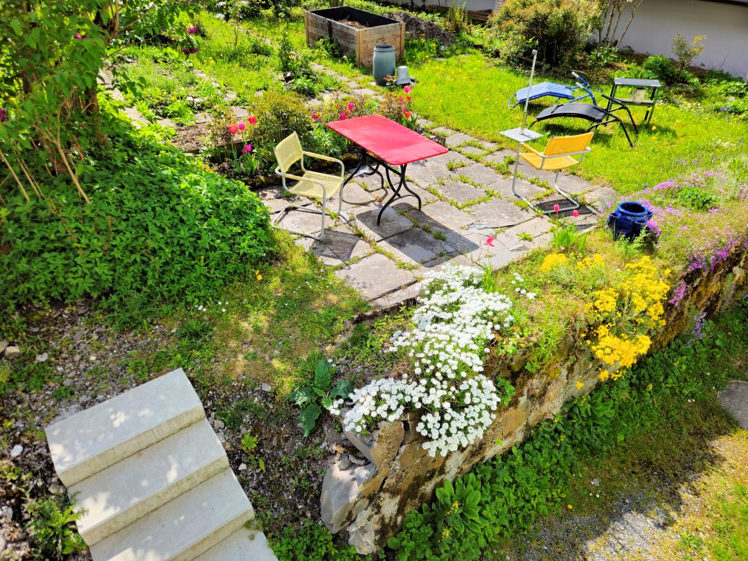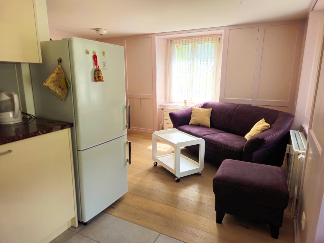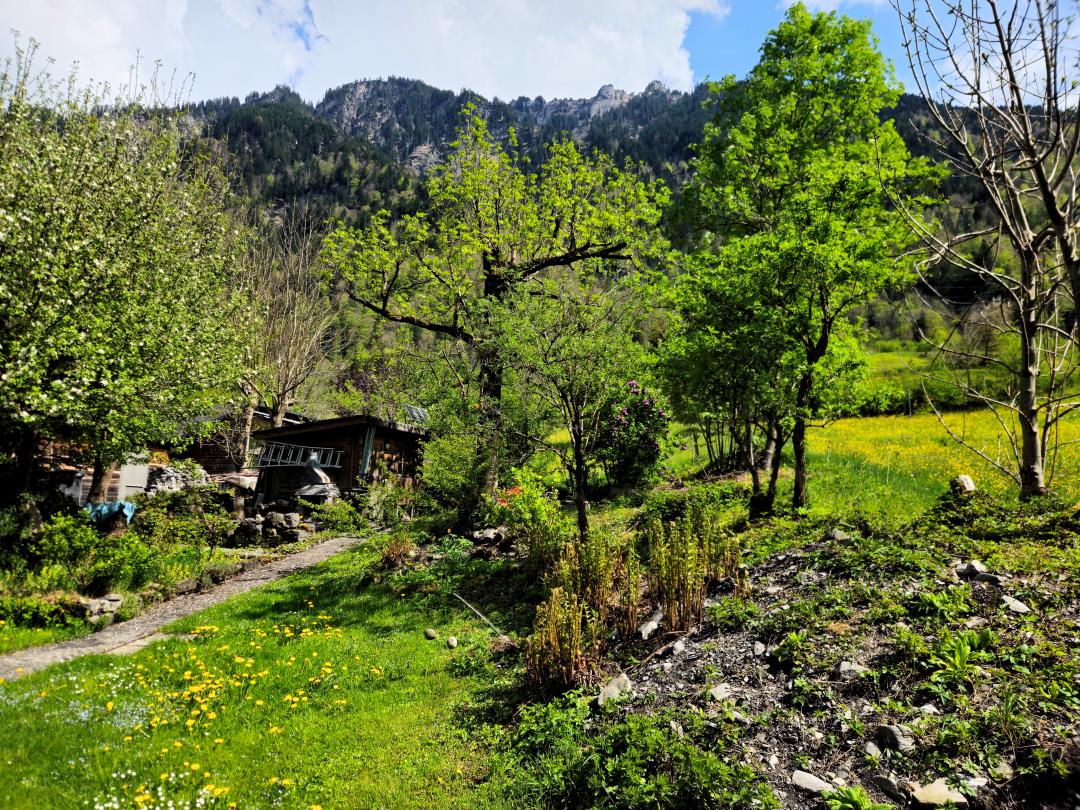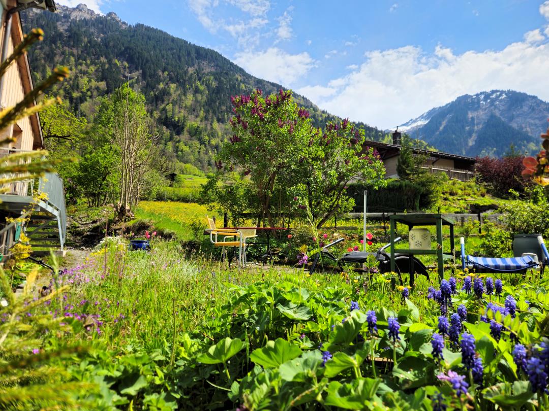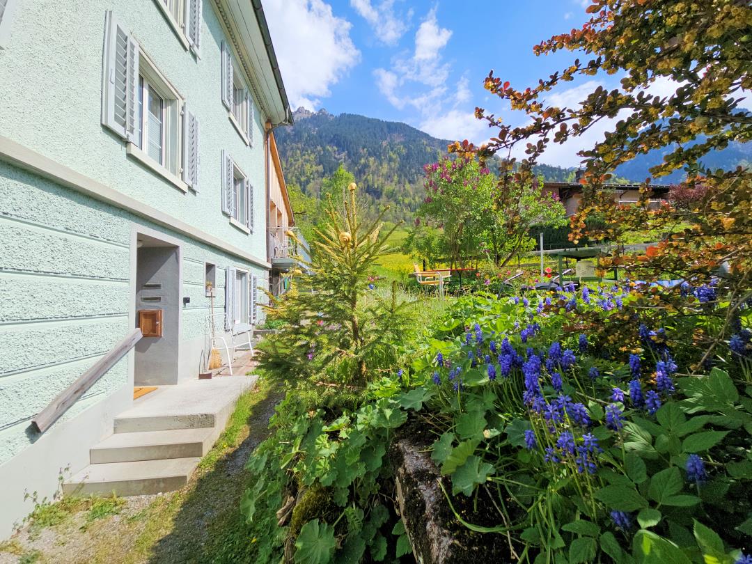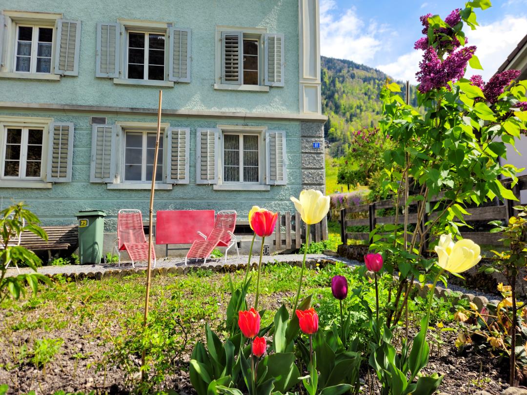 Komfortable Ferienwohnung (2 Zi, Dusche/WC, moderne Küche) mit privatem Garten, S-Bahn-Anschluss, in 90 Min. nach Zürich. Erholung pur in wildromantischer Berglandschaft.